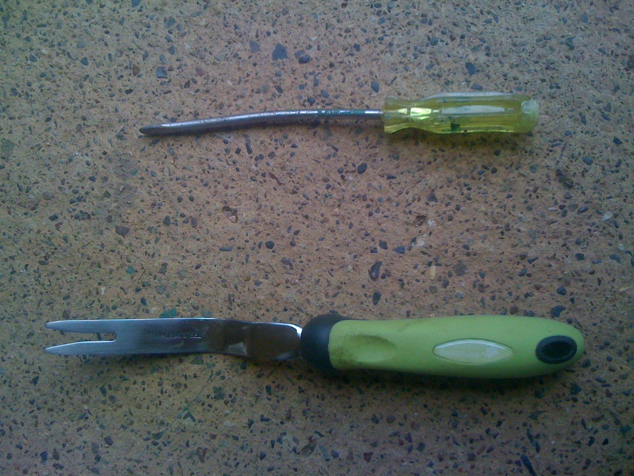 The right tool for pulling weeds and the wrong tool (a screwdriver)