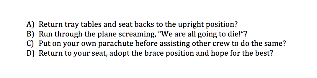“Welcome aboard. Our highly qualified pilots and cabin crew are here to assist you. We have all correctly answered over 1,000 multiple choice questions that are designed to cover any circumstances that might arise during our flight today. Please fasten your seat belt in the manner indicated in answer C and place your seat backs and tray tables in the position shown in answer B.”
